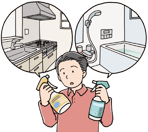 家の汚れには、大きく分けて2種類あります。一つは、ほこりや手垢などの「一般汚れ」、もう一つは、時間がたって落ちにくくなった汚れや、焦げや変性した汚れなどの「特殊汚れ」です。特殊汚れには、材質を傷めず効率よく落とすために、汚れの種類に適した専用の洗剤※を使うとよいでしょう。使用前には必ず使い方と注意事項を確認しましょう。