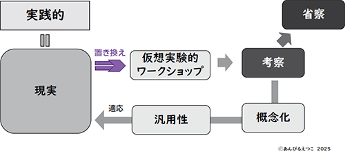 そこで有効なのが仮想実験的ワークショップです。仮想の条件のもと自身の考えで意思決定し、その体験をもとに概念化し、現実の状況にも応用可能な力を育てるものです(図1)。前述の「カレー作りゲーム」も、その一例です。