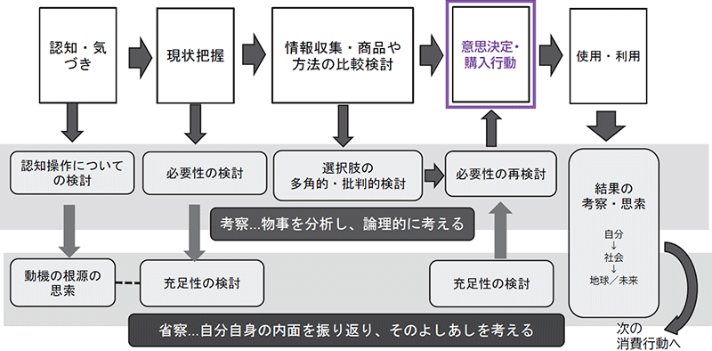 さらに、ワークショップの振り返りの中で、「省察」を促すことも大切です。ここでいう省察とは、自分自身の内面を振り返り、そのよしあしを考えることです。消費行動のプロセスにおける考察と省察の関係を示した図2にあるように、経済的意思決定の過程では、この省察が大きな役割を果たします。これまで、経済学は基本的に消費は効用の増大をもたらすと考えてきました。しかし、ショーペンハウアーが「富は海水のようなもので、飲めば飲むほどのどがかわく」と表現したとおり、消費や蓄財が必ずしも充足をもたらすとは限りません。
